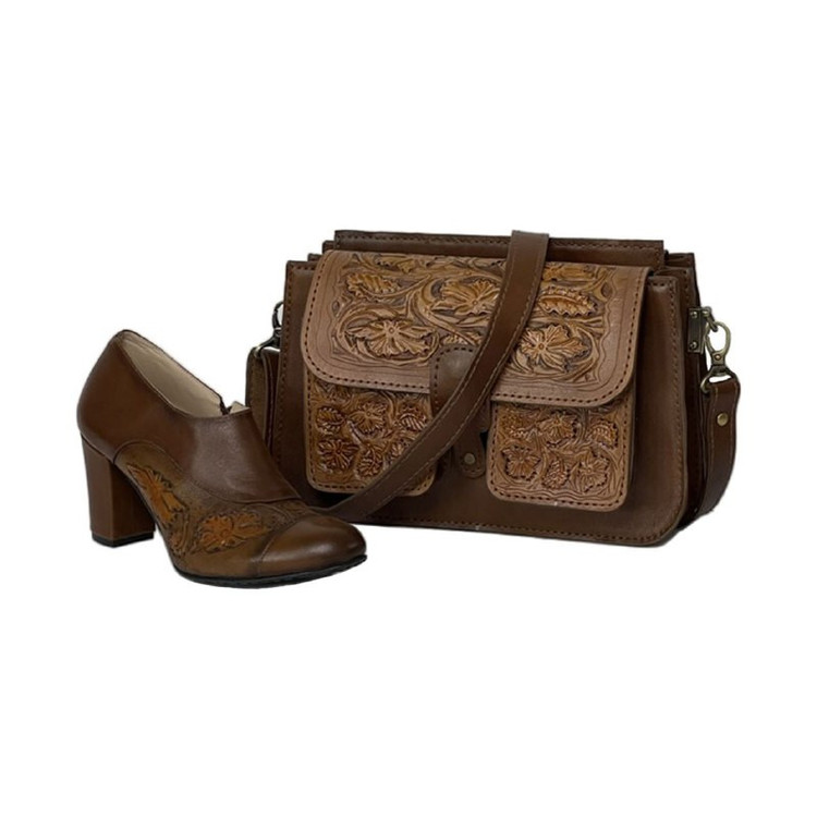 ست کیف و کفش چرم طبیعی ، حکاکی (قلمزنی شده )با دست و دوخت تمیز و کاملا دستدوز بسیار خاص ;با چرم طبیعی درجه 1 کاملا دست دوز بسیار شیک و جادار دارای بند دوشی چرم و دست دوز ، جیب داخلی و خارجی و زیپ می باشد مناسب برای: مناسب برای بانوان هنر دوست ...