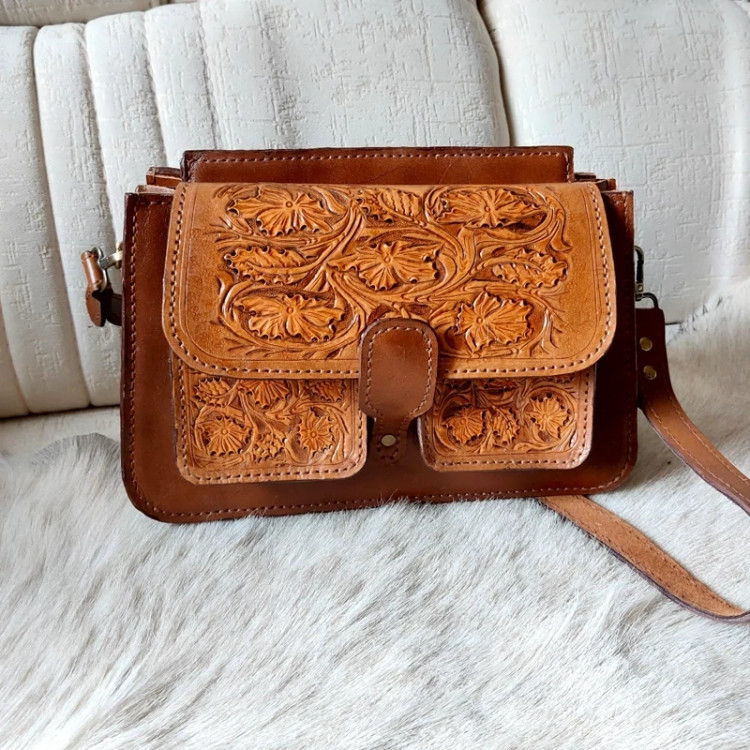 کیف و کفش قلم زنی زنانه با چرم طبیعی دست دوز و دارای قلم زنی روی چرم خام دارای جدا کننده زیپ روی کیف و ۲ عدد جیب کوچک و ۲ عدد جیب بزرگ میباشد