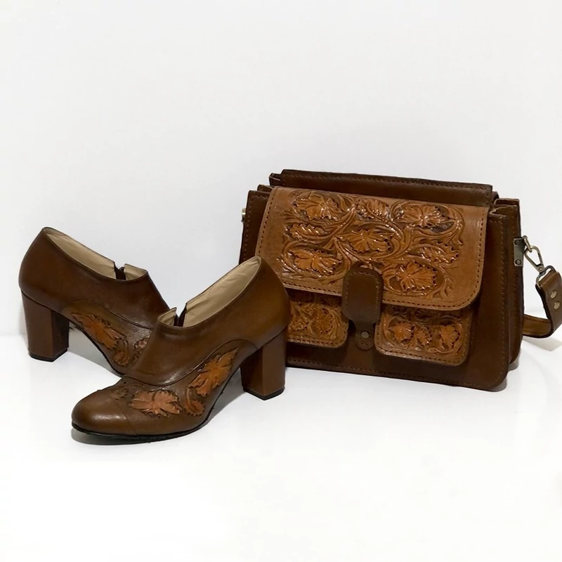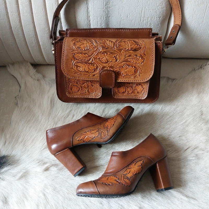 کیف و کفش قلم زنی زنانه با چرم طبیعی دست دوز و دارای قلم زنی روی چرم خام دارای جدا کننده زیپ روی کیف و ۲ عدد جیب کوچک و ۲ عدد جیب بزرگ میباشد
