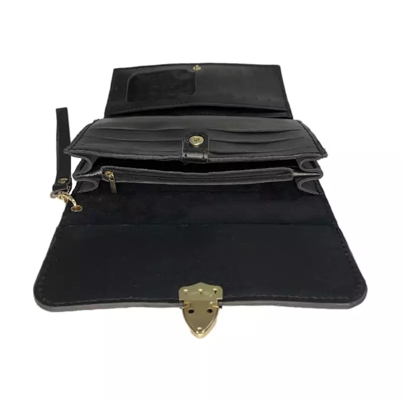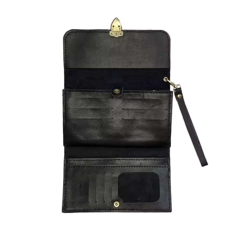 شیک و جادار دارای بند دستی محکمات کارت و جای پول و جای گوشی - قسمت زیپ دار و حای عکس میباشد
